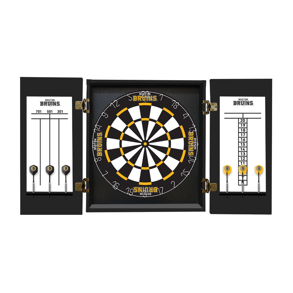 The Fan's Choice Bristle Dartboard Cabinet features your favorite team logo and includes a premium 18-inch tournament-sized self-healing bristle dartboard. Self-healing bristle dartboards are some of the longest-lasting boards available, as the holes close up after each dart is removed. This hanging dartboard cabinet will look great in your fan cave or any room where your family and friends gather. It is easy to assemble; the cabinet comes preassembled and is ready to hang on the wall. Simply secure the dartboard, and you are set to enjoy hours of fun!