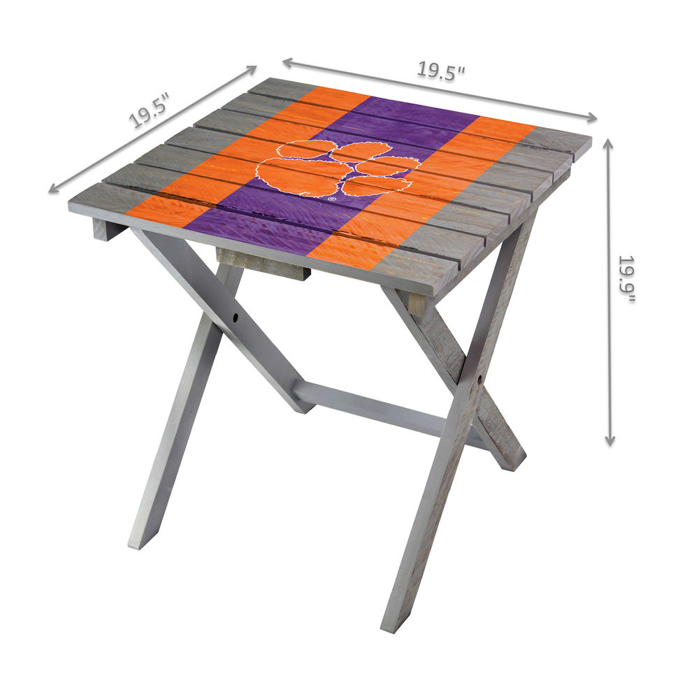 Enhance your patio or backyard with this Wooden Clemson University Folding Adirondack Table. Crafted from solid, high-quality pine wood, this table showcases your favorite team's logo and conveniently folds for easy storage and transportation. Featuring a classic slatted square design, it looks great on its own or as an accent piece next to your Adirondack chair. This product is officially licensed by the NCAA.