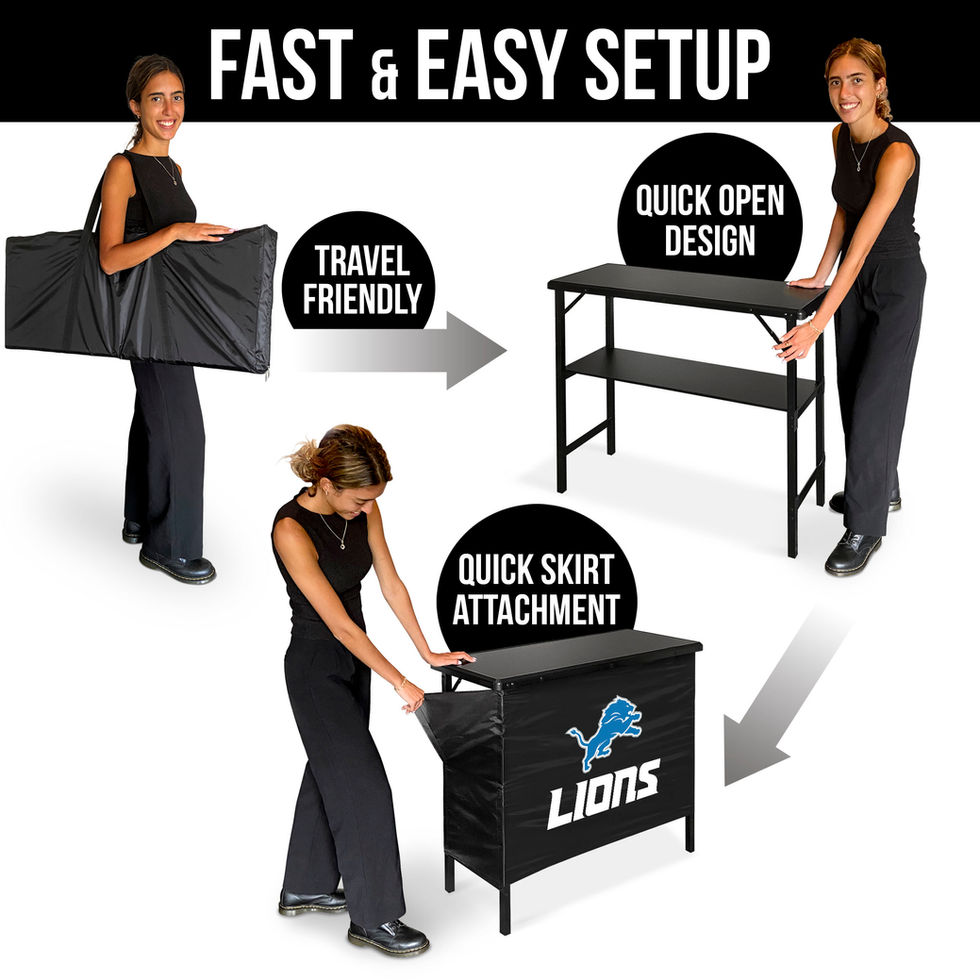 Show off your team pride in style with the Detroit Lions Portable Bar—the ultimate fan accessory for game day gatherings, backyard BBQs, or enhancing your man cave. This bar features a durable aluminum frame, a sleek MDF top, and a removable polyester cover, making it both functional and eye-catching. With a vibrant, full-color team logo, it is sure to be the centerpiece of any room or outdoor party. Whether you're hosting at home or heading to a friend's house, the included carry case makes it easy to bring the party with you.