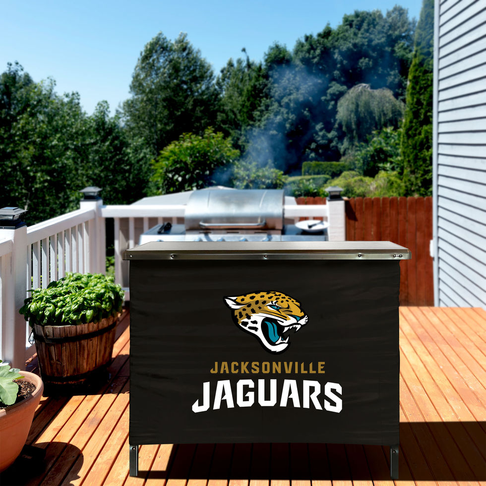 Show off your team pride in style with the Jacksonville Jaguars Portable Bar—the ultimate fan accessory for game day gatherings, backyard BBQs, or enhancing your man cave. This bar features a durable aluminum frame, a sleek MDF top, and a removable polyester cover, making it both functional and eye-catching. With a vibrant, full-color team logo, it is sure to be the centerpiece of any room or outdoor party. Whether you're hosting at home or heading to a friend's house, the included carry case makes it easy to bring the party with you.