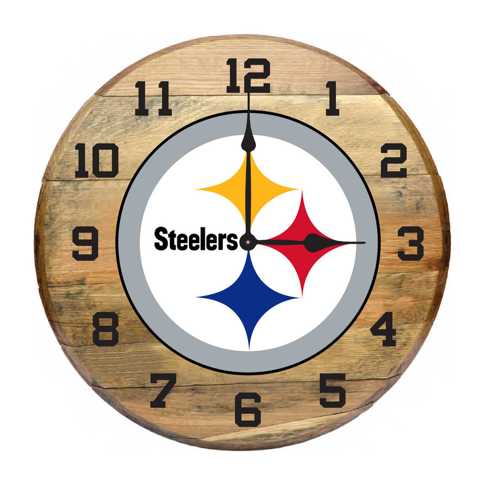 It's game time with this officially licensed Pittsburgh Steelers custom-made oak barrel clock from Imperial! Made from an authentic charred Kentucky oak whiskey barrel top, this rustic-style clock is one-of-a-kind and will look great in your living room or fan cave. The team logo is applied by injecting UV-resistant ink into the oak and then sealing it