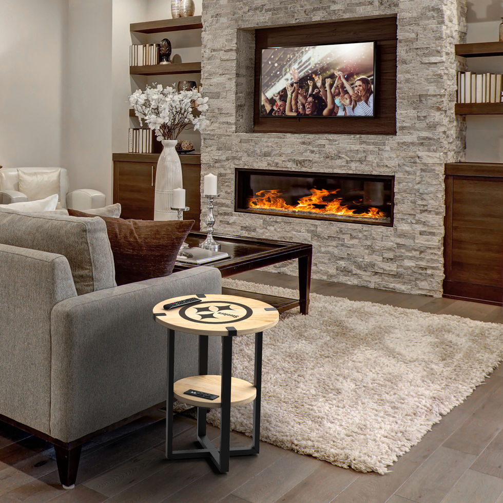 This laser-etched round side table has a modern design that seamlessly blends with various decorative styles. It offers convenient functionality for charging up to 4 devices at one time on the 2nd tier shelf. The 2-tier shelf also provides ample space to store your TV remote and other small items. Whether you're a fan or simply appreciate well-crafted furniture, this side table is a versatile addition to any room.